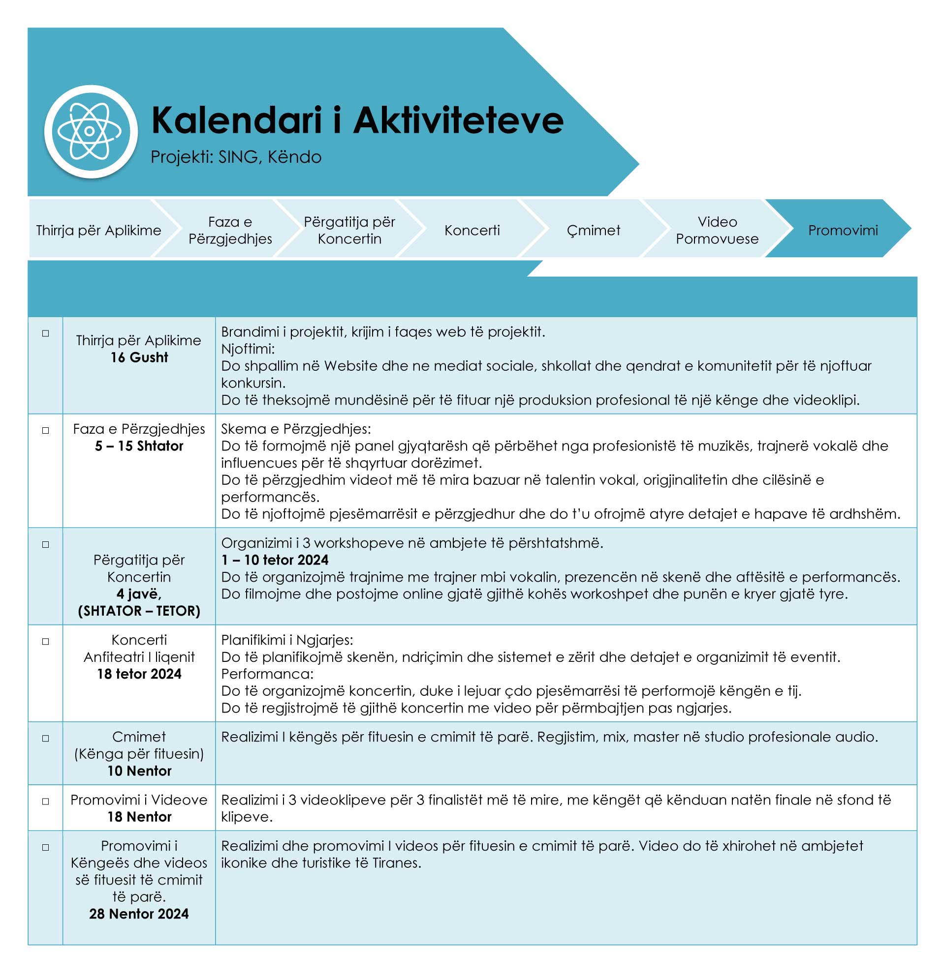Objektivi I projektit është të zbulojmë dhe promovojmë talentet e reja në këngë duke ofruar një platformë për të shfaqur aftësitë e tyre, për të marrë trajnime profesionale dhe për të performuar në një koncert live.